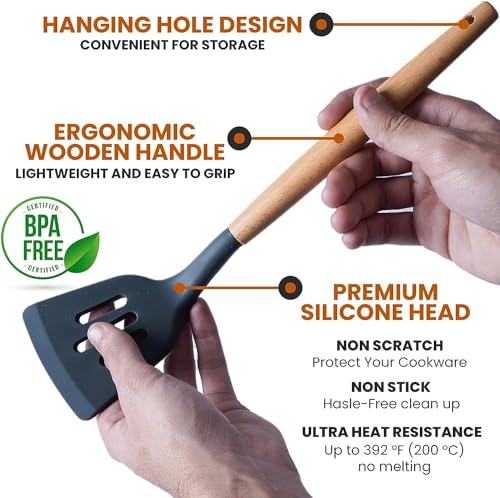 - 【مقاومة لدرجات الحرارة العالية】كما تمت إضافة السيليكون للتصميم بالكامل ما يضمن النعومة، لا داعي للقلق من التصاق الطعام بأدوات الطهي بعد الآن. تتميز برأس من السيليكون تحمي طاسات القلي، وتحافظ على سطح حلل الطهي من الخدوش أو الانبعاج. يطيل عمر جميع أواني مطبخك. فهي مقاومة للخدش، على عكس الأدوات البلاستيكية والمطاطية التي تذوب بسهولة أو الأدوات المعدنية التي تضر الأواني غير اللاصقة، يمنع المقبض الخشبي المريح انتقال الحرارة، مما يوفر تجربة طهي آمنة.