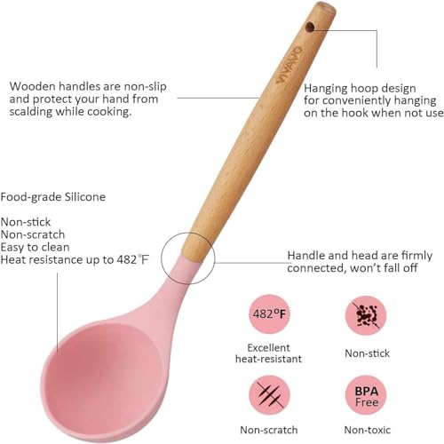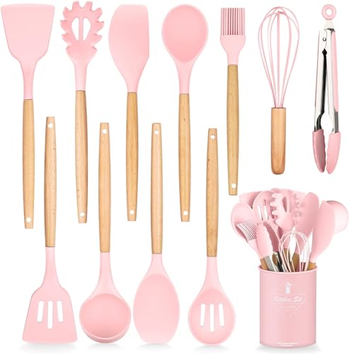 Generic - طقم أدوات مطبخ من السيليكون 12 قطعة مع حامل – أدوات طبخ غير لاصقة ومقاومة للخدش، تتحمل الحرارة العالية، بمقابض خشبية مريحة، آمنة للاستخدام اليومي (بيج)