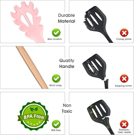 - سيليكون غذائي آمن وعالي التحمل مصنوع من سيليكون غذائي عالي الجودة يتحمل درجات حرارة مرتفعة دون ذوبان أو تشوه، ولا يتفاعل مع الطعام أو يغيّر نكهته، مما يجعله مثاليًا للطهي اليومي والاستخدام الطويل الأمد.