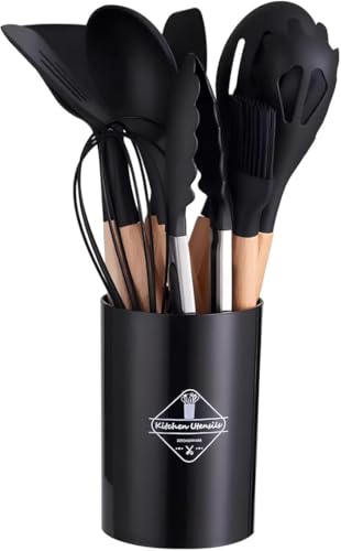 Generic - مجموعة أدوات مطبخ من السيليكون 12 قطعة، أدوات طبخ بمقبض خشبي مع دلو تخزين، أسود