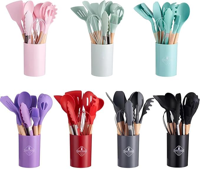 - مجموعة كاملة: تتضمن مجموعة أدوات المطبخ المصنوعة من السيليكون المكونة من 12 قطعة أدوات طهي أساسية بمقابض خشبية مريحة ودلو تخزين أسود أنيق