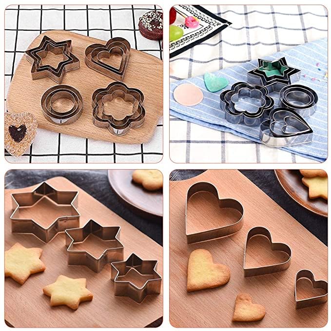 - تتضمن المجموعة: إجمالي 12 قطعة من قواطع البسكويت بأشكال القلب والنجمة والزهور والدائرة، 3 أحجام مختلفة من كل شكل