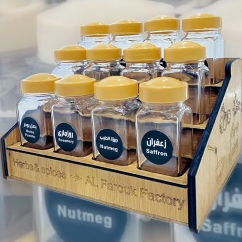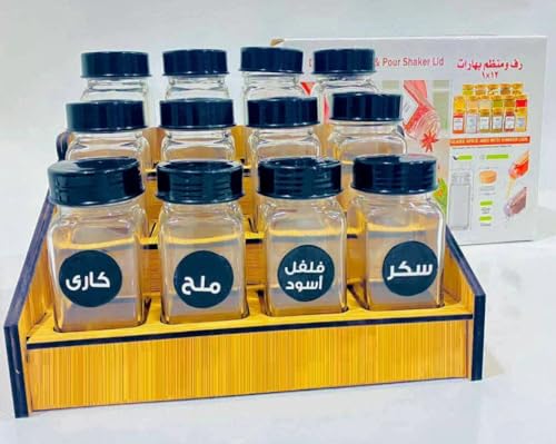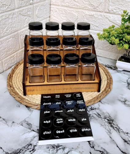 - منظم مجموعة توابل زجاجي بحامل خشبي مكون من 12 قطعة مع مجموعة من ملصقات التوابل يساعدك على التنظيم