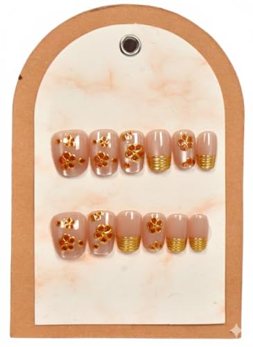 Generic - أظافر صناعية جاهزة للارتداء، تصميم أزهار ذهبية وبرونزية، 12 قطعة، أظافر قدم مزينة بالورود