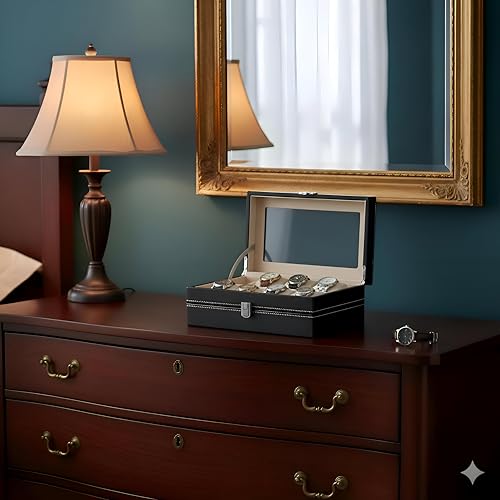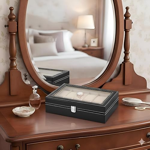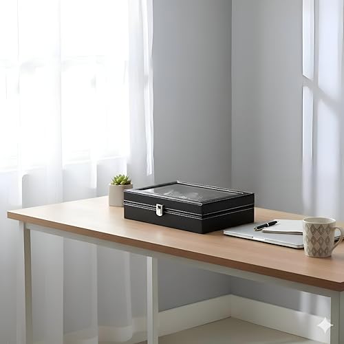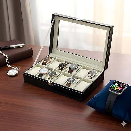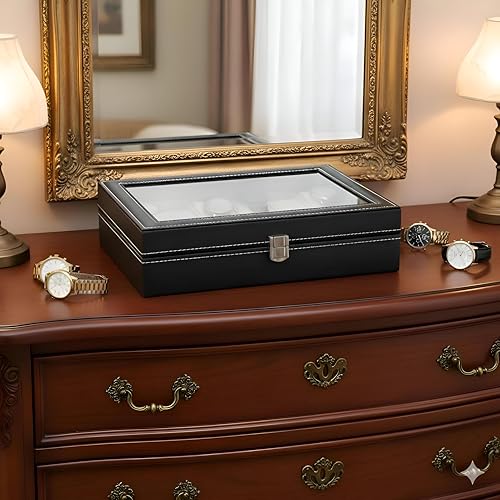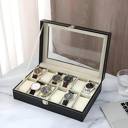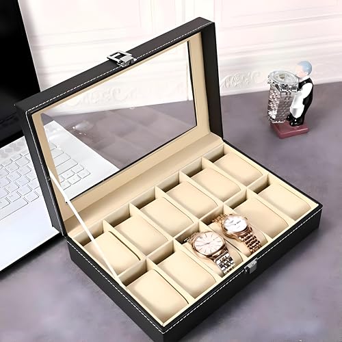 Generic - صندوق ساعة بـ 12 فتحة - 12 فتحة منفصلة، غطاء زجاجي، بطانة مخملية، مثالي للتنظيم والعرض الامن، جلد، مقاس 31 × 21 × 8 سم