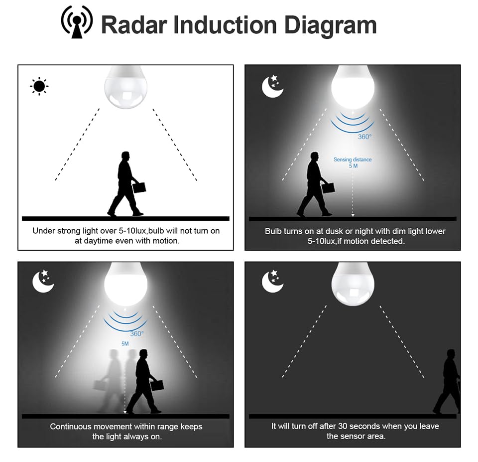 - أمان وراحة: يوفر المصباح مستوى عاليًا من الأمان والراحة، حيث يقلل من الحاجة إلى تشغيل وإطفاء الأضواء يدويًا، مما يتيح تجربة مريحة في الأماكن ذات الحركة المتكررة. كما يسهم في تحسين الأمان في الأماكن التي تحتاج إلى إضاءة فورية عند دخولها.