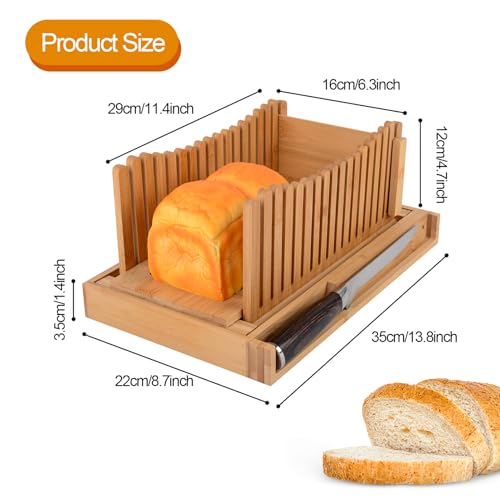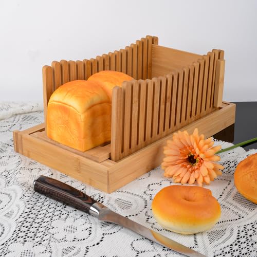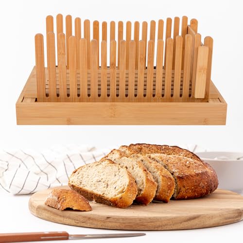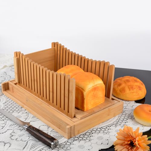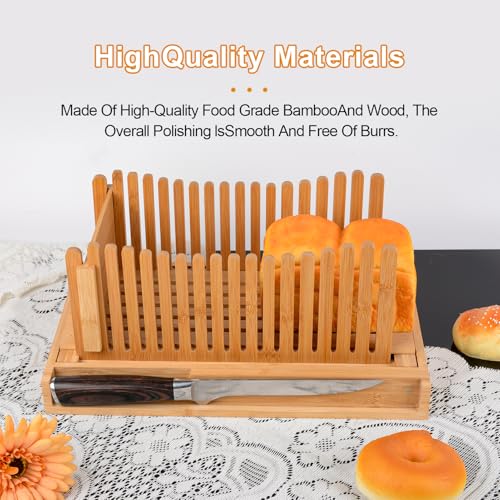 Haayymo - قطاعة شرائح الخبز قابلة للطي من خشب البامبو، مقاس 35.05 × 21.84 × 3.81 سم بسمك صغير قابل للتعديل مع صينية التقاط الفتات للخبز المنزلي والكيك