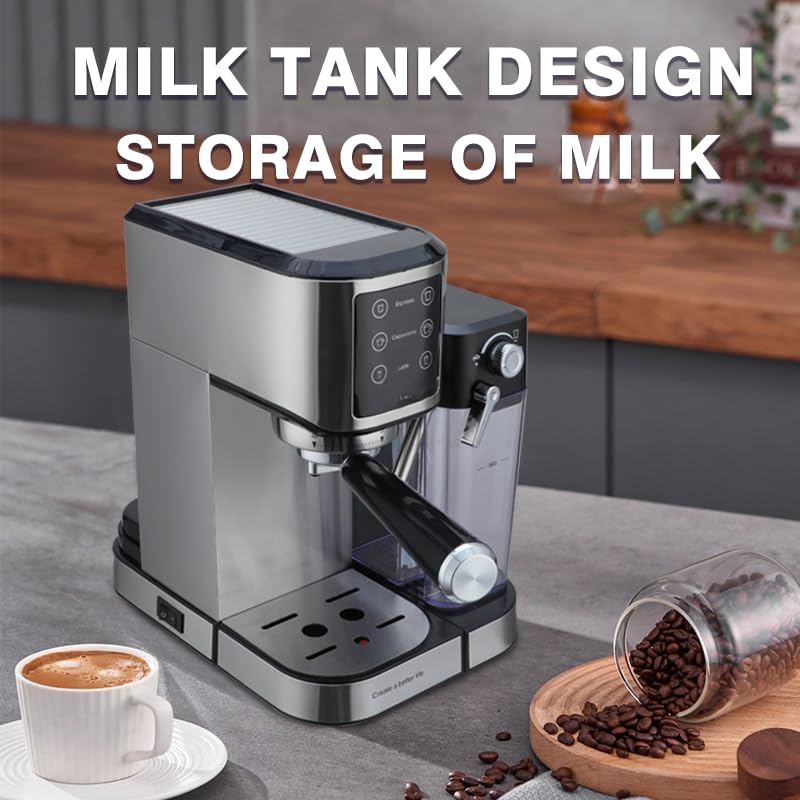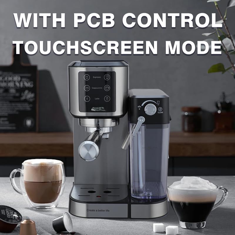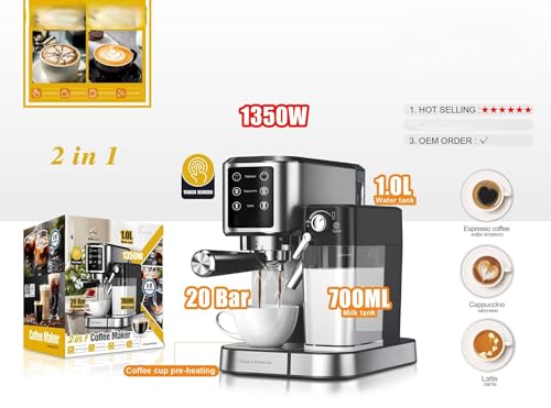 Generic - ماكينة قهوة 2 في 1 بقدرة 1350 واط مع ضغط 20 بار وشاشة لمس لتحضير الإسبريسو واللاتيه والكابتشينو – خزان مياه 1 لتر وخزان حليب 700 مل – تسخين سريع وتصميم ستانلس ستيل أنيق مع ضمان 12 شهر