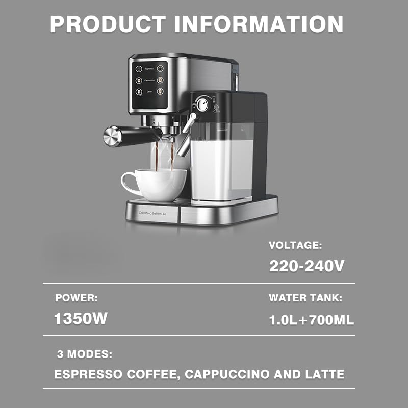 - ☕ تحضير احترافي للقهوة في المنزل – اصنع الإسبريسو، الكابتشينو، أو اللاتيه كما في المقاهي بفضل ضغط 20 بار وقوة 1350 واط لاستخلاص مثالي وغني بالنكهة.