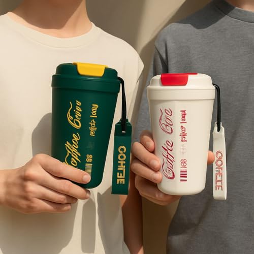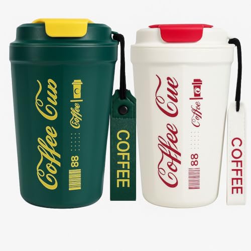 Generic - مج للقهوة للسفر بسعة 13 اونصة مع غطاء مانع للتسرب للمشروبات الساخنة/المثلجة بجدار مزدوج عازل بتفريغ الهواء. (اخضر و ابيض)