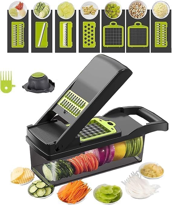 Generic - 14-in-1 قطاعة خضروات متعددة الوظائف، مبشرة يدوية مع حاوية تجميع، شفرات قابلة للتبديل للخضروات والفواكه والجبن، لون أسود وأخضر، مع واقي لليد ومصفاة