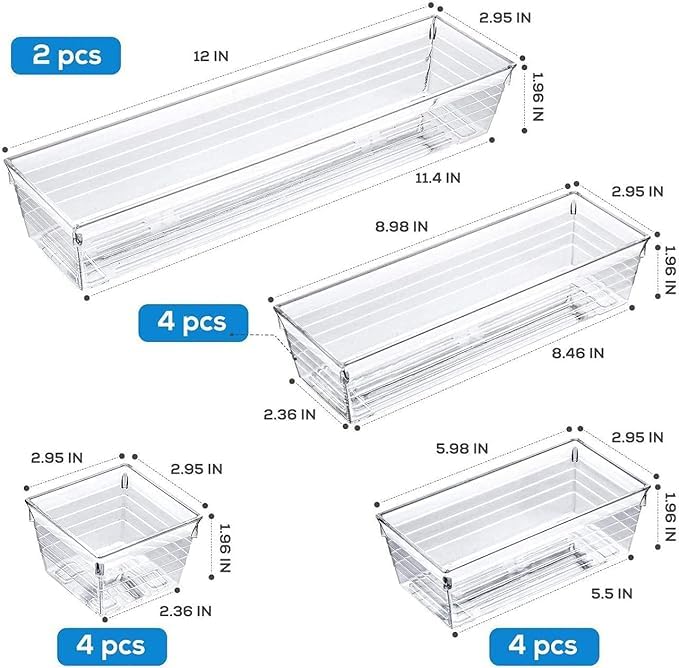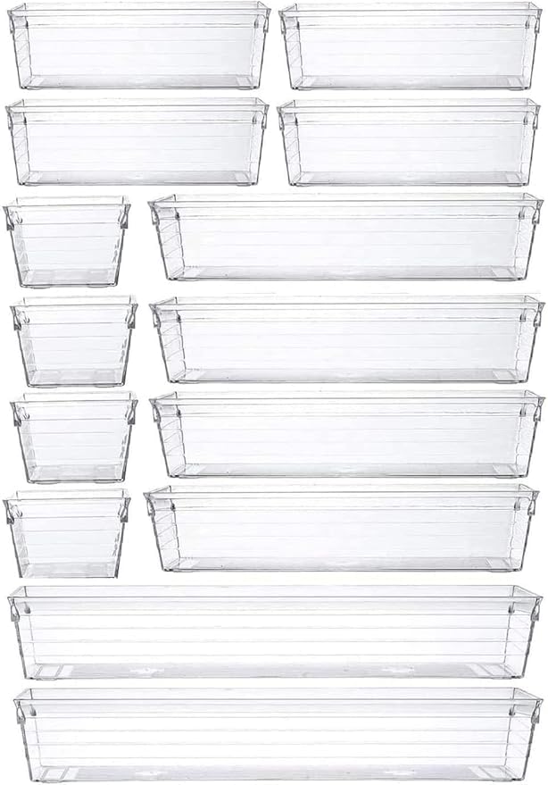 - مجموعة كاملة: تتضمن مجموعة منظم الأدراج المكونة من 14 قطعة أحجام متعددة من صواني التخزين البلاستيكية الشفافة لحلول تنظيم متعددة الاستخدامات