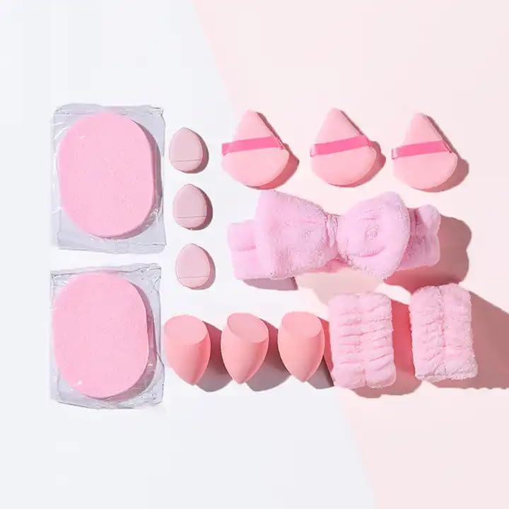 Generic - مجموعة ادوات وضع المكياج مكونة من 15 قطعة مع اسفنجات ووسائد للوجه وشريط شعر وشريط معصم (بينك)