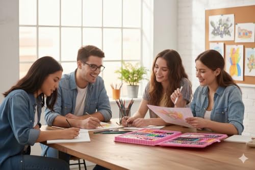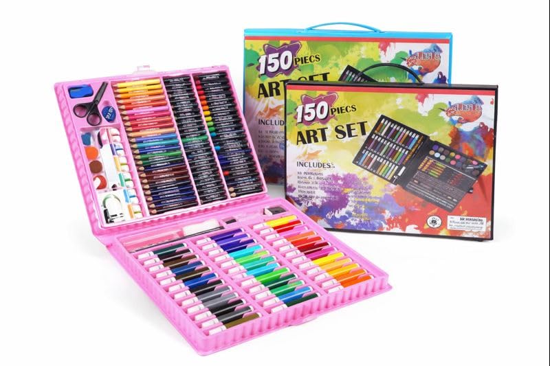 - مجموعة فنية شاملة: طقم رسم وتلوين متكامل يحتوي على 150 قطعة متنوعة تشمل أقلام تلوين خشبية، ألوان مائية، أقلام شمعية، أقلام فلوماستر، وباستيل لتلبية جميع احتياجات الإبداع الفني