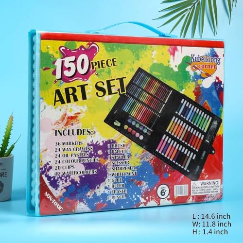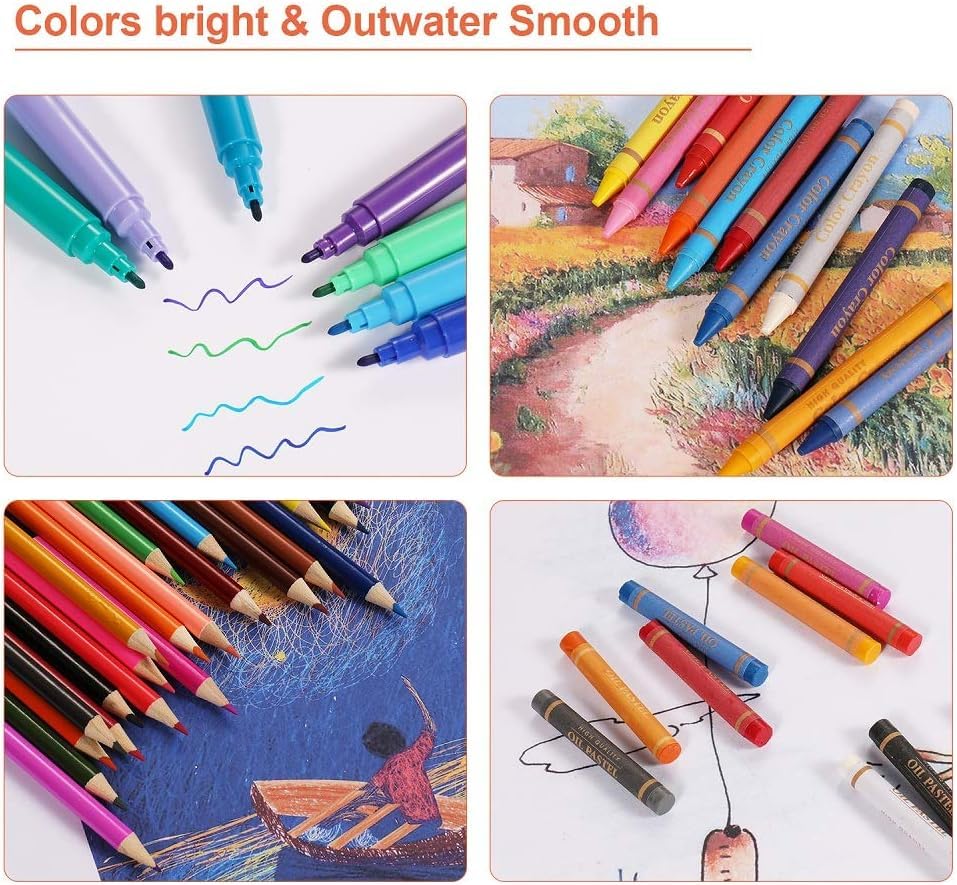 - مشاعرك الإبداعية ليس لها حدود مع 150 قطعة متنوعة: افتح الصندوق لتعثر على كنز فني متكامل! يحتوي هذا الطقم الشامل على 36 قلم ماركر بألوان زاهية للرسم الدقيق، و24 قلم باستيل زيتي لمزج سلس وناعم، و24 قلم خشبي ملون للتفاصيل الدقيقة، و24 قلم شمعي للتلوين السميك والواضح، بالإضافة إلى 12 لوناً مائياً سحرياً و30 قطعة متنوعة تشمل فرش رسم عالية الجودة، لوحة خلط ألوان، ممحاة، مبراة، مسطرة، مقص آمن، صمغ، مشابك متعددة وأقلام رصاص HB للرسم الأساسي