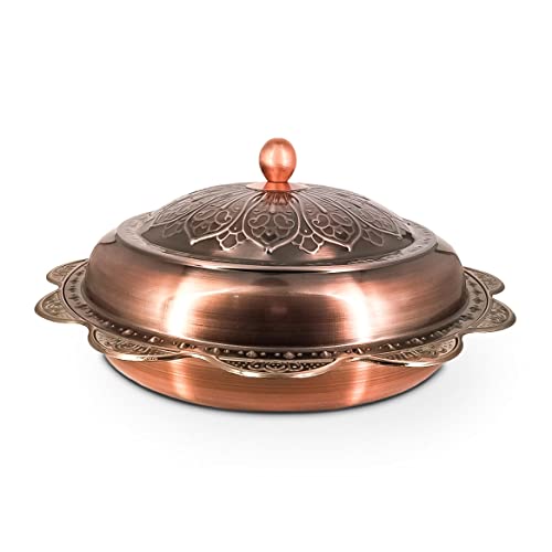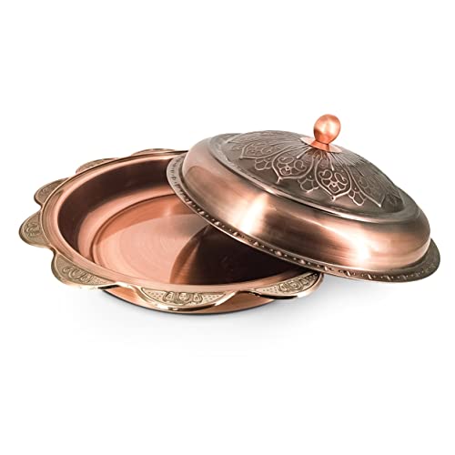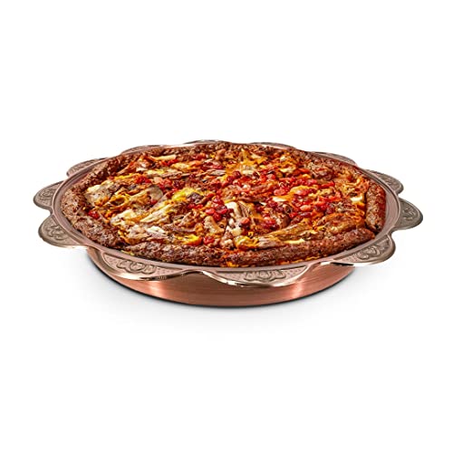 - - صينية من النحاس النقي بنسبة 100% - صواني الطعام الخاصة بنا مصنوعة من النحاس عالي الجودة ومغطاة بطبقة آمنة غذائيًا للمساعدة في مقاومة البقع والحفاظ على هذا اللمعان الجميل لسنوات قادمة.