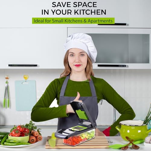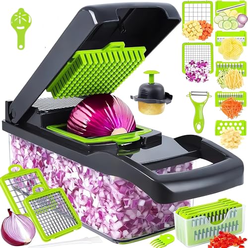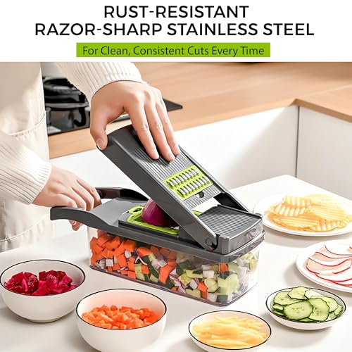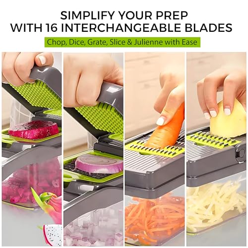 CarboSpin - قطاعة خضروات 16 في 1 مع شفرات من الستانلس ستيل وحاوية تخزين، قطاعة مطبخ متعددة الوظائف للتقطيع والتقطيع والبشر وجوليان، خالية من البيسفينول ايه وسهلة التنظيف