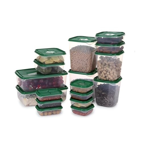 Generic - مجموعة علب تخزين طعام شفافة مع غطاء محكم للحفاظ على الطعام طازجًا، خالية من BPA، مناسبة للحبوب والدقيق والتوابل والمكسرات والفواكه والخضروات - لون اخضر جذاب من 17 قطعة