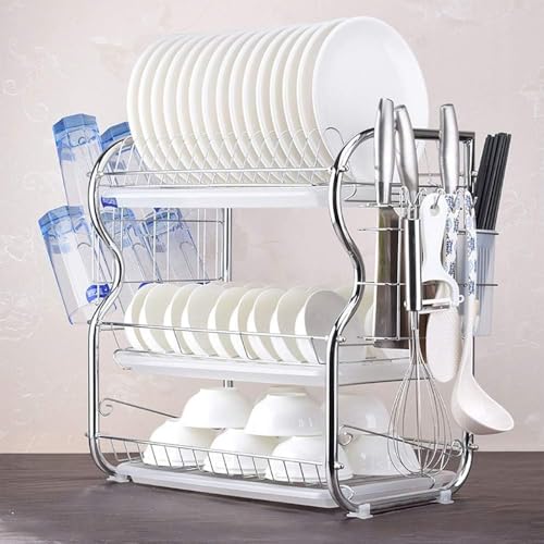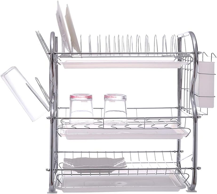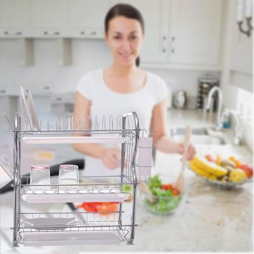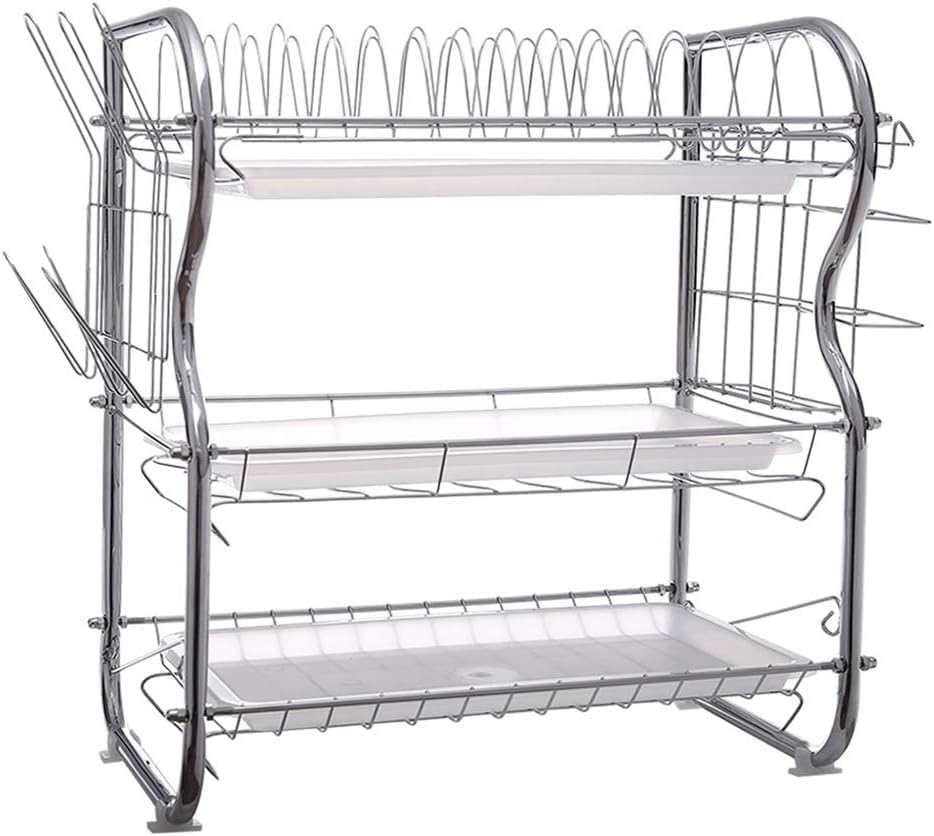 Generic - رف تجفيف أطباق ثلاثي المستويات من الفولاذ المقاوم للصدأ 18/10 بتصميم موفر للمساحة مع حوامل جانبية وصواني تصريف