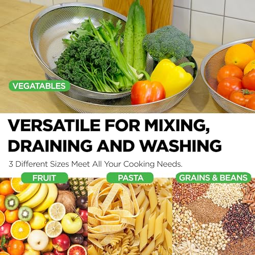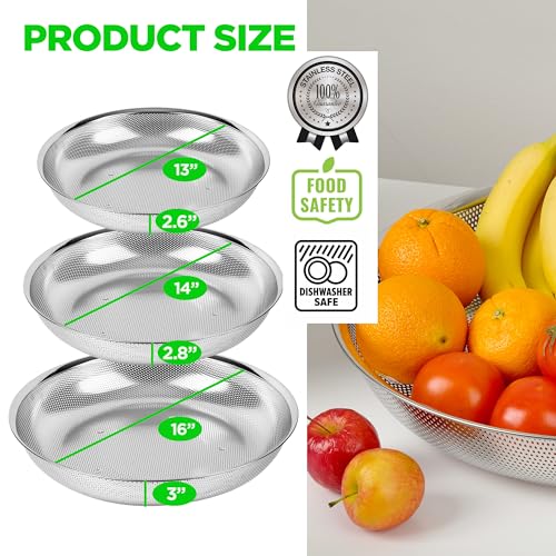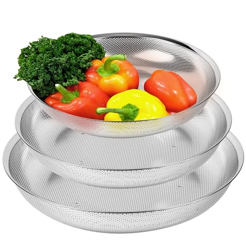 COMPORT K - مجموعة مصافي ستانلس ستيل 304 18/8 مكونة من 3 قطع، مصافي وصينية مسطحة مثقبة دقيقة، مجموعة 5.5-7-10 كوارت، قاعدة صلبة ذاتية التصريف للمعكرونة والفواكه والخضروات، صنع في كوريا - كومبورت كيه