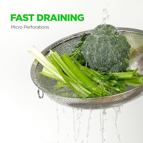- مثقوبة بدقة من أجل الكفاءة: مصممة بثقوب دقيقة، توفر المصفاة الخاصة بنا متانة وكفاءة فائقة مقارنة بالتصميمات التقليدية. مثالي لغسل مجموعة متنوعة من الأطعمة، حيث يضمن هيكله عالي الجودة المصنوع من الستانلس ستيل 304 أداءً يدوم طويلاً. تسمح الثقوب الدقيقة بتصريف فعال، مما يجعلها إضافة عملية لأي مطبخ.