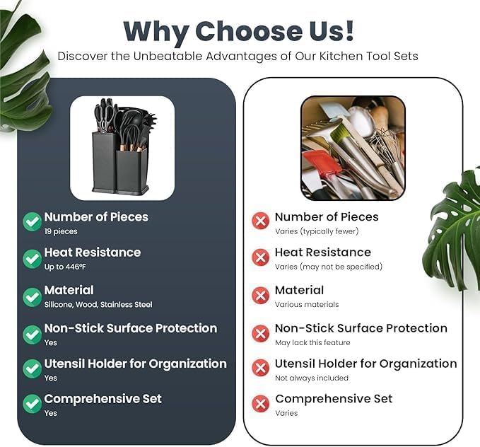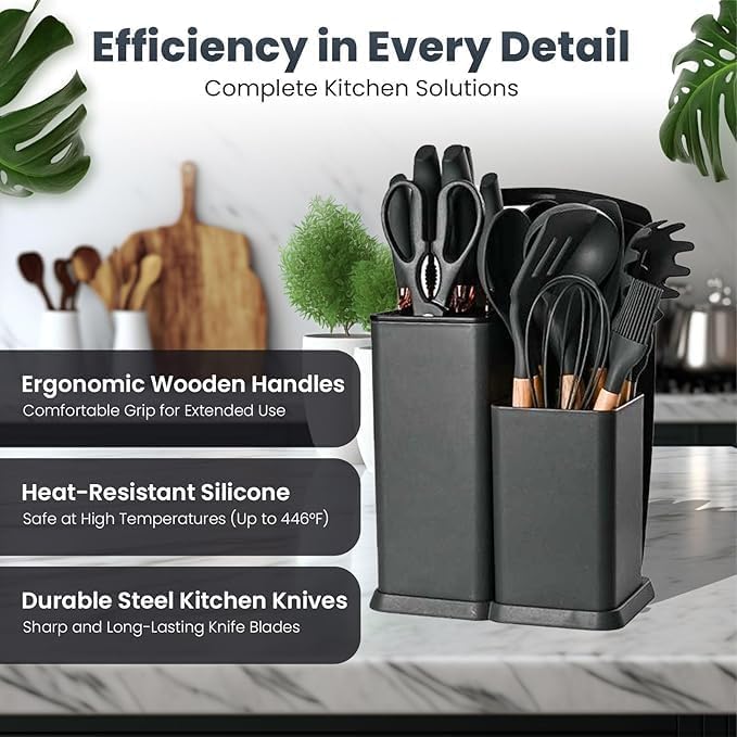 - ١) مجموعة شاملة: طقم مطبخ متكامل يضم 18 قطع من أدوات الطهي الأساسية مع حامل تخزين أنيق مقسم