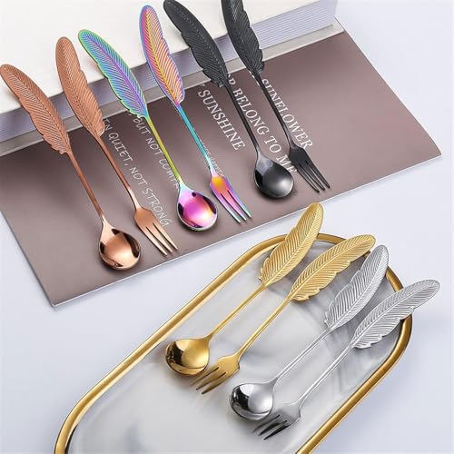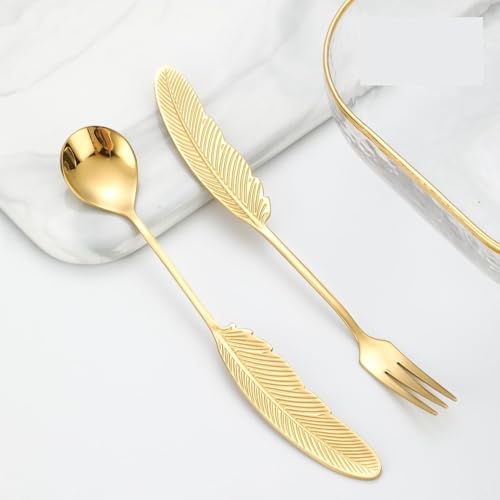 Generic - طقم معالق وشوك وسكاكين حلويات ستانلس ستيل 18 قطعة ذهبي فاخر تصميم ريشة للتقديم والمناسبات المنزلية والفندقية مع لمسة أناقة وفخامة رائعة