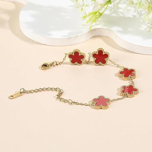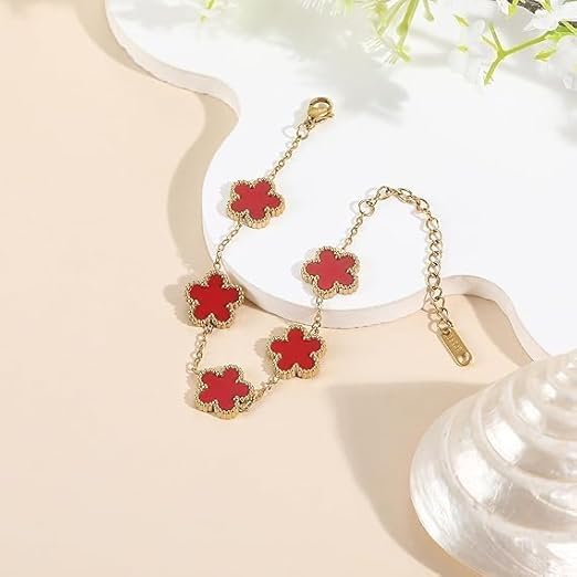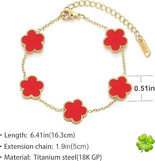 Generic - سوار الحظ من الفولاذ المقاوم للصدأ مطلي بالذهب عيار 18 قيراط للنساء، أساور أنيقة على شكل زهرة بأربع أوراق شجر، هدايا مجوهرات للنساء والبنات المراهقات، أحمر
