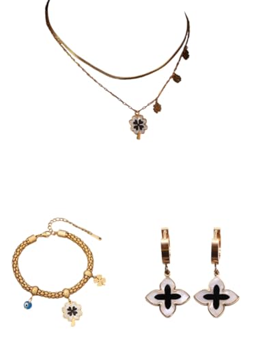 Generic - سوار من الستانلس ستيل المطلي بالذهب عيار 18 قيراط للنساء، الحظ بنقشة ورقة البرسم رباعية الأوراق متصلة، هدية مجوهرات اسود