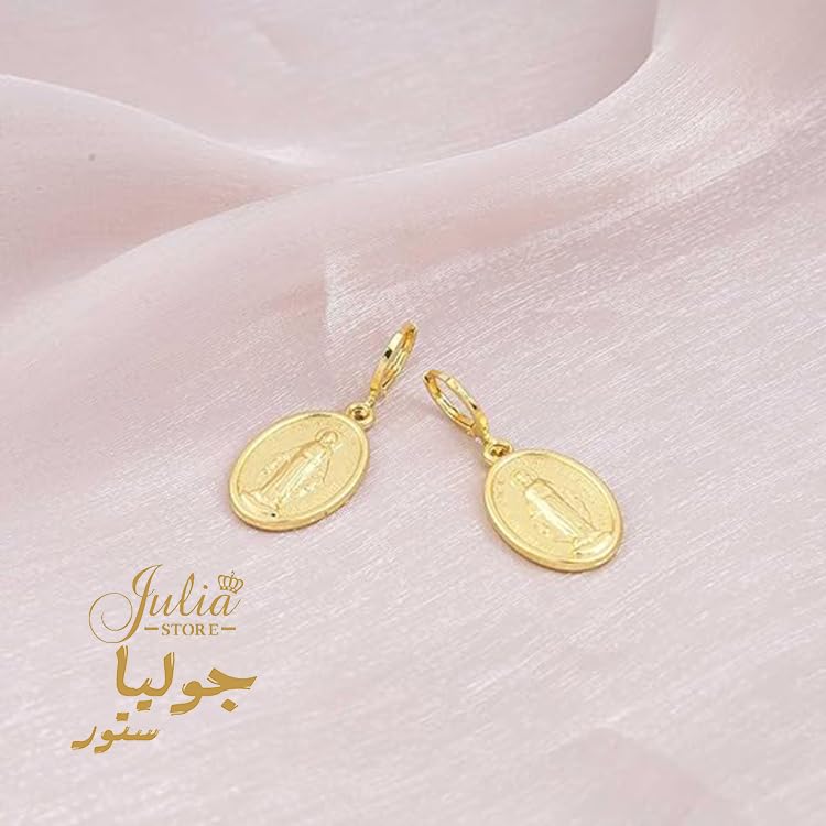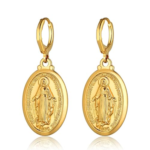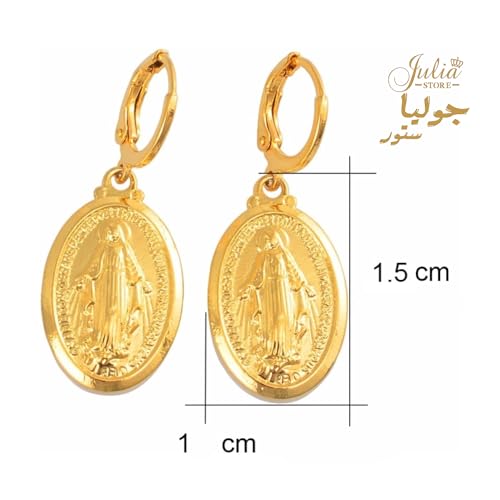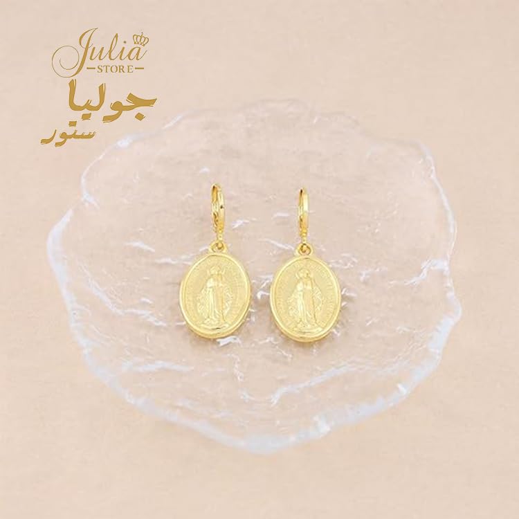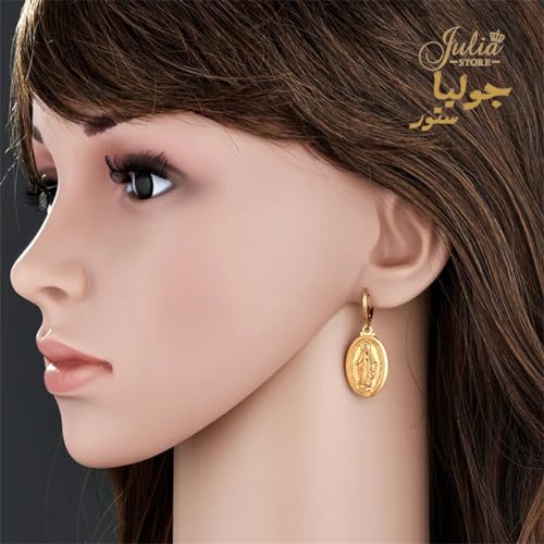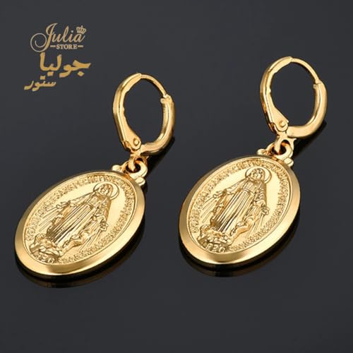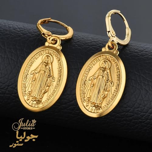 Julia Store - حلقان متدلية من الستانلس ستيل المطلي بالذهب عيار 18 قيراط بتصميم فينتاج ماري العذراء سانتا ماريا، حلقان ذهبية بيضاوية على شكل عملة معدنية من مجوهرات ماري العذراء من جوليا ستور، للنساء