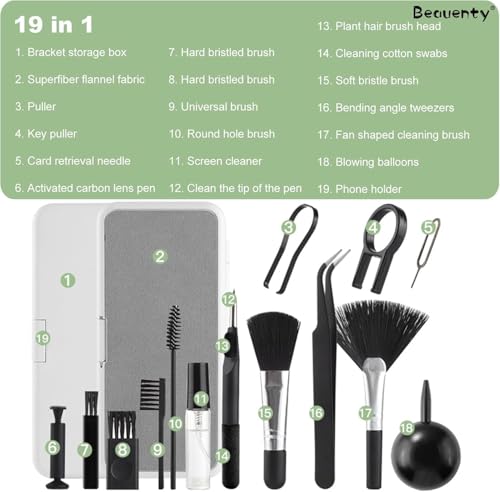 - 【مجموعة تنظيف كاملة للجهاز】 توفر مجموعة التنظيف الإلكترونية 19 في 1 مجموعة كاملة من الأدوات لتنظيف كل ركن من أركان أجهزتك الإلكترونية، بما في ذلك الفرش ومنفاخ الهواء وأقمشة المايكروفايبر، مما يساعد على إزالة الغبار وبصمات الأصابع والأوساخ مع الحفاظ على الشاشات والكيبورد نظيفة وأداء كالجديد.