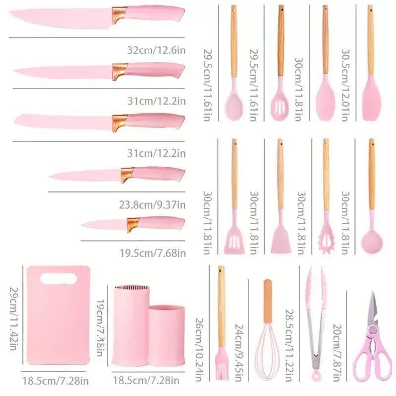 - مجموعة شاملة من 19 قطعة: توفر هذه المجموعة مجموعة كاملة من أساسيات المطبخ، تتضمن عادةً مجموعة متنوعة من أدوات الطبخ المصنوعة من السيليكون ومجموعة سكاكين من الستانلس ستيل، وغالبًا ما تكون مع لوح تقطيع وحامل تخزين.