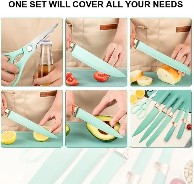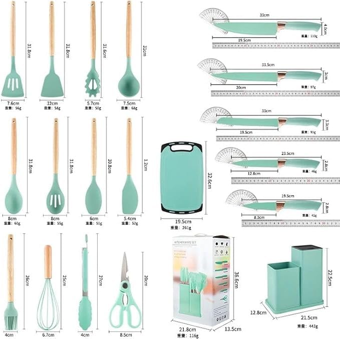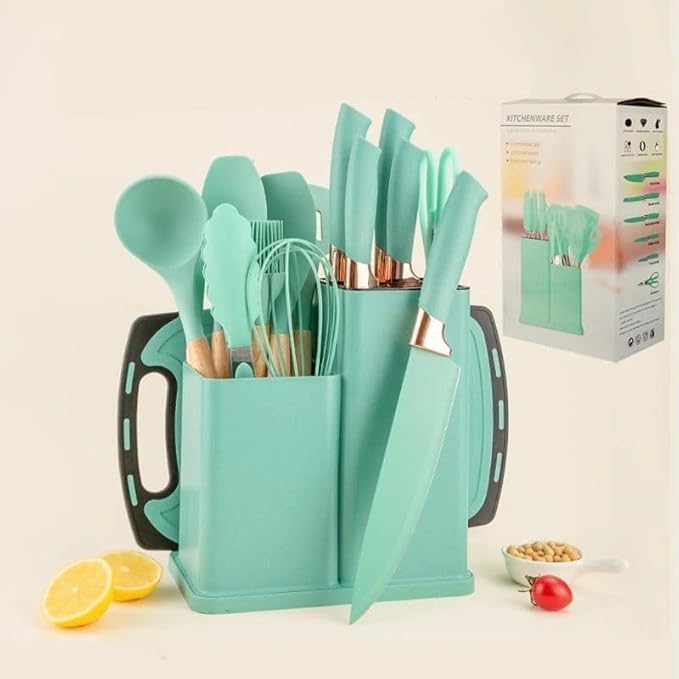 Generic - مجموعة ادوات طبخ وسكاكين للمطبخ مكونة من 19 قطعة، تتضمن 11 قطعة من ادوات الطبخ المصنوعة من السيليكون و5 قطع سكاكين شيف حادة من الستانلس ستيل ومقص وملقط خفق ولوح تقطيع ( فيروزي )