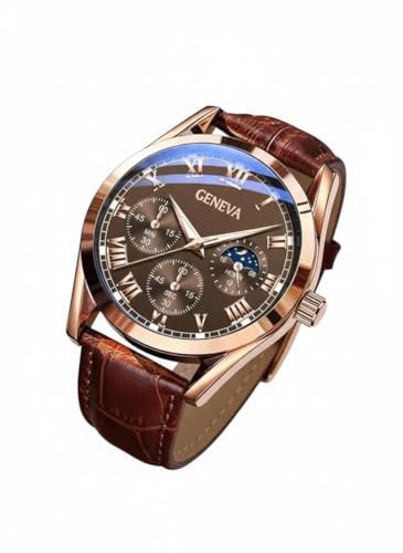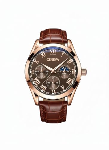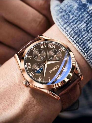 ساعة عمل للرجال بثلاثة عيون ومينا بأرقام رومانية وسوار جلدي من قطعة واحدة (ذهبي)