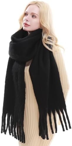عام - سكارف بلون سادة، سكارف رقبة دافئة للشتاء، سكارف صوف سميك محبوك بشراشيب سميكة، سكارف شتوي، كوفية شتوى كبيرة للنساء (لون أسود)