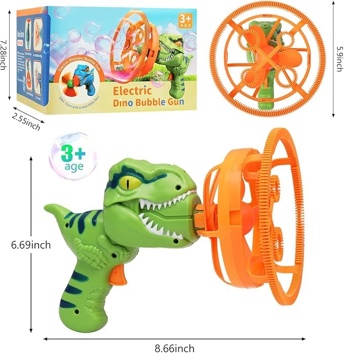 - تصميم مبتكر: مسدس فقاعات على شكل ديناصور مع آلية عجلة دوارة يخلق تأثيرات فقاعات داخل الفقاعات لتعزيز متعة اللعب