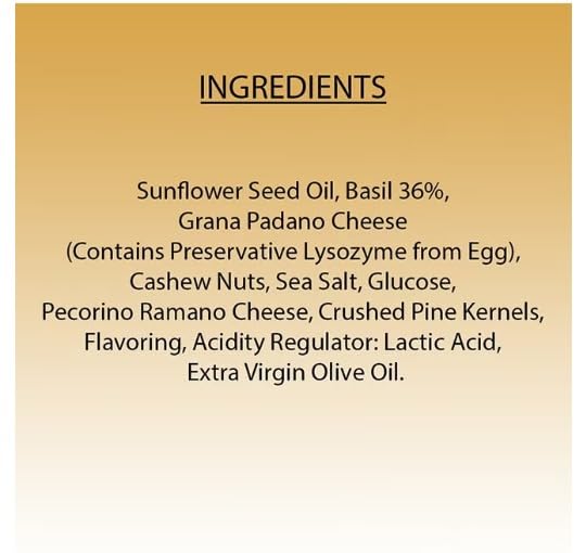 - مكونات فاخرة: يحتوي على ريحان طازج، زيت زيتون بكر ممتاز، أجبان إيطالية (بارميزان وبيكورينو)، صنوبر، كاجو، وثوم لمذاق وقوام أصيلين