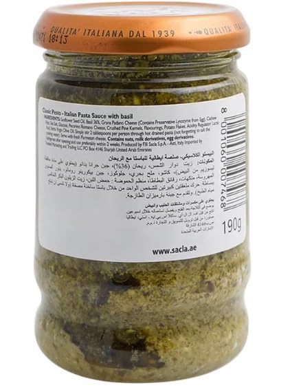 - بيستو إيطالي أصيل: صلصة بيستو ساكلا مصنوعة من الريحان الإيطالي الطازج، وزيت الزيتون البكر الممتاز، وجبنة البارميزان والبيكورينو، والكالنجو البحر الأبيض المتوسط الكلاسيكية