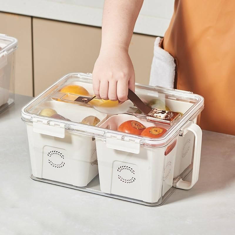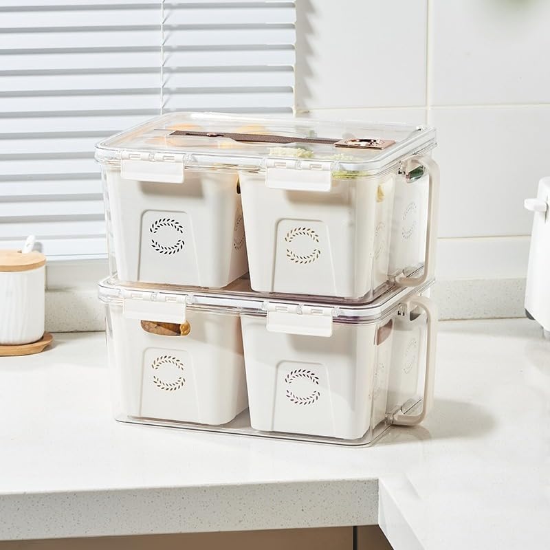 Generic - منظم ثلاجة اكريليك شفاف بغطاء محكم وفتحة تهوية – علبة تخزين خضروات وفاكهة مقسمة 2 عين مع حاويتين داخليتين – مقاس 31×21×15.5 سم