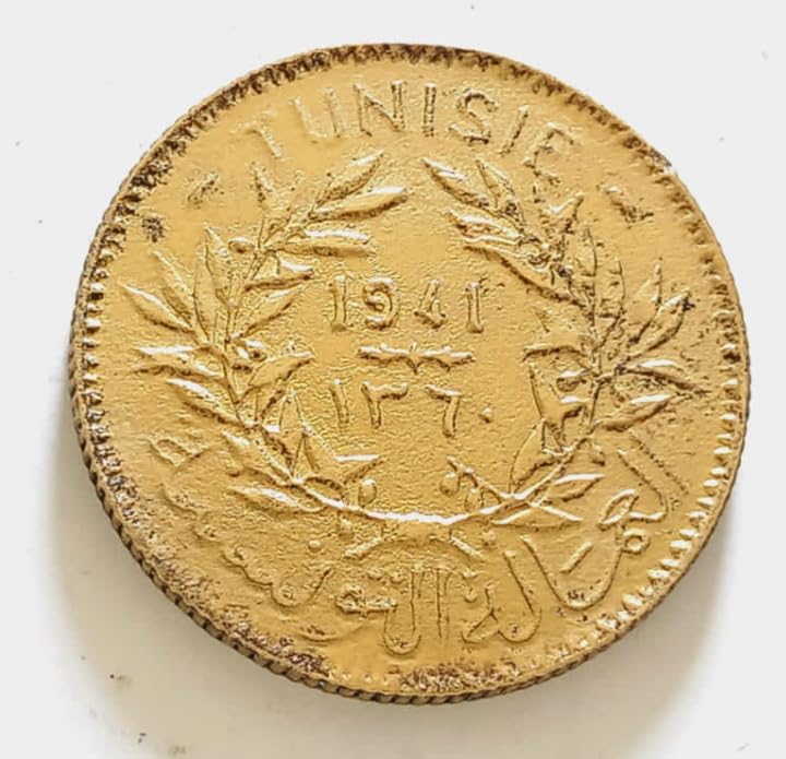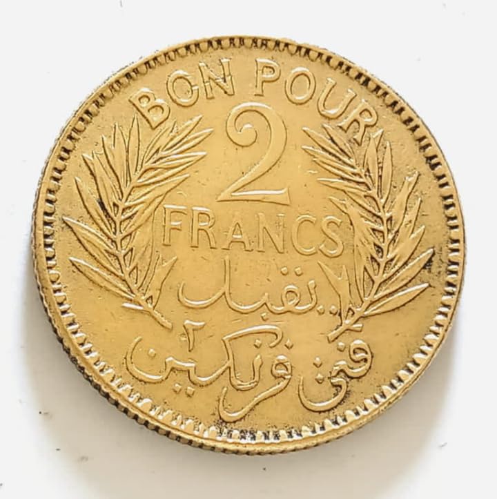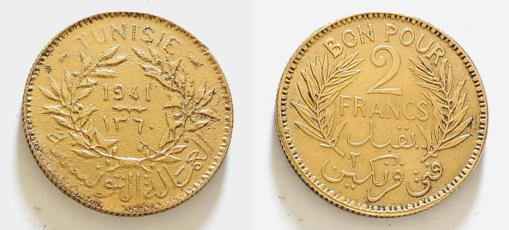 - عملة تاريخية: فرانكان تونسيان من فترة الحماية الفرنسية على تونس، قطعة نقدية أصلية من عام ١٩٤١ ميلادي