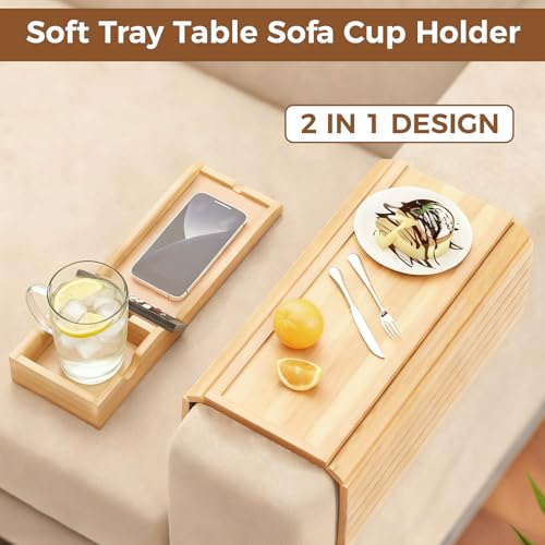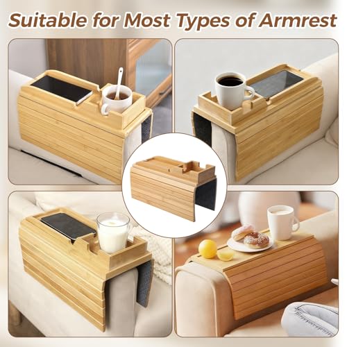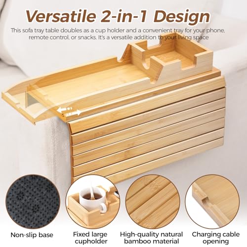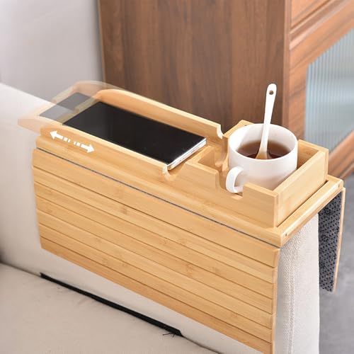 Refein - طاولة كنبة 2 في 1 مصنوعة من البامبو، صينية مسند ذراع خشبية قابلة للطي مع حامل أكواب وحامل موبايل، طاولة مسند ذراع للكنبة مضادة للانزلاق للمشروبات والمجلات وجهاز التحكم عن بعد