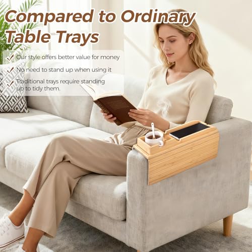 - توافق عالمي للأريكة: مقاس 16.1 × 13.4 انش، صينية مسند الذراع المصنوعة من الخيزران تناسب معظم الأرائك، بما في ذلك التصميمات العريضة أو الملفوفة أو المستقيمة. استمتع بإمكانية الوصول بسهولة سواء كنت تسترخي أو تسلية