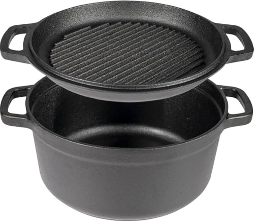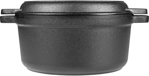 Generic - حلة فرن هولندي 2 في 1 من الحديد المصبوب مع غطاء طاسة شواء، مقاس 25 سم، مطلية بطبقة زيتية مسبقًا، لون أسود