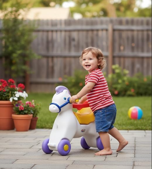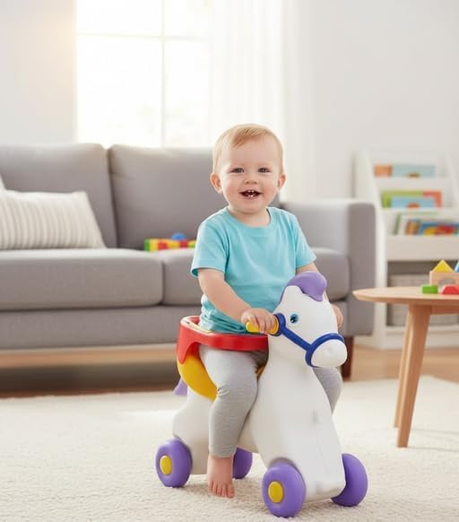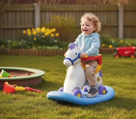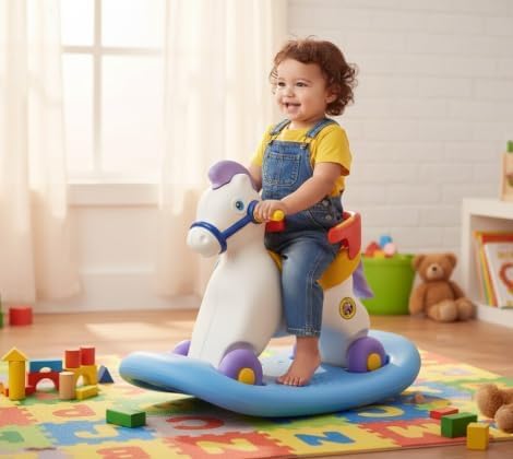 - تصميم قابل للتحويل 2 في 1 يتحول بسهولة من حصان هزاز كلاسيكي إلى لعبة ركوب متحركة، مما يوفر وضعين للعب في تصميم واحد متين.