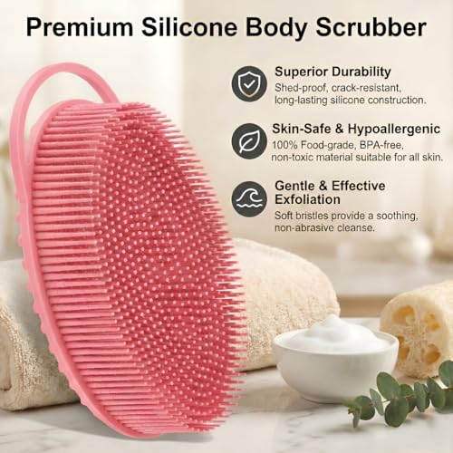 LIEBCTRL - فرشاة تنظيف الجسم 2 في 1 للنساء والرجال مصنوعة من السيليكون بيد طويلة، فرشاة تقشير ناعمة بديلة لليفة ولطيفة لمستلزمات الاستحمام والعناية اليومية بالجسم، فرشاة استحمام لتنظيف البشرة الحساسة (وردي)