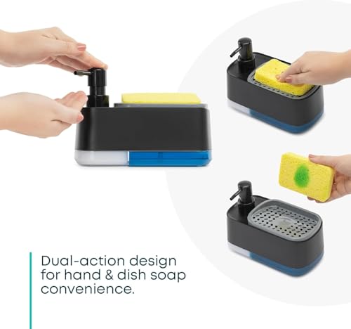 - وظيفة مزدوجة: يتميز بتصميم مريح 2 في 1 يجمع بين موزع صابون سعة 350 مل وحامل إسفنجي مدمج لتنظيف المطبخ المنظم