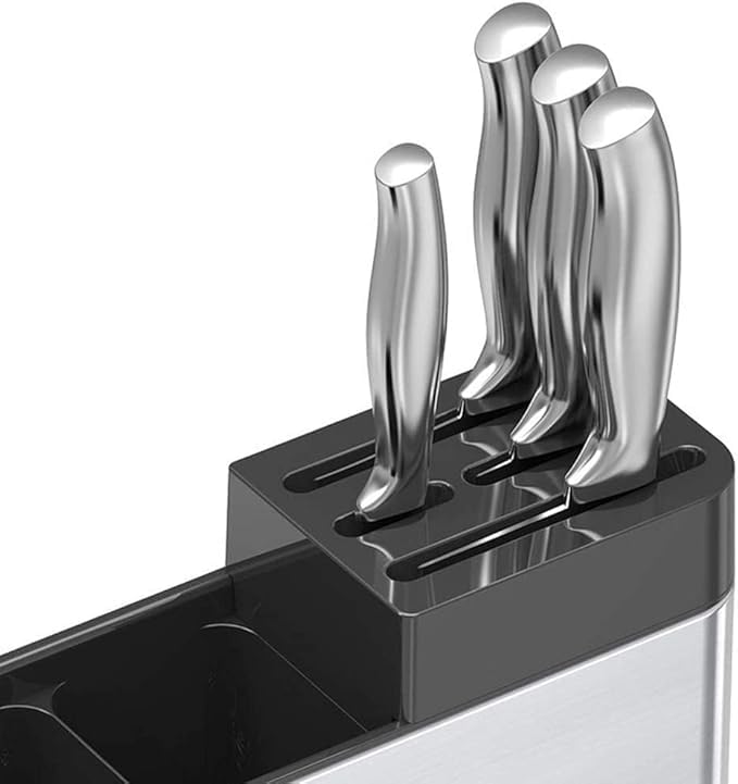 - ✅ (صفاية معالق ورشاقة سكاكين 2 في 1) مصنوعة من الستانليس ستيل 304 المقاوم للصدأ وتأتي بقاعدة بلاستيكية لتصريف المياه بسلاسة وحماية من التآكل، مما يضمن لكِ تنظيمًا وأناقة في مطبخك.