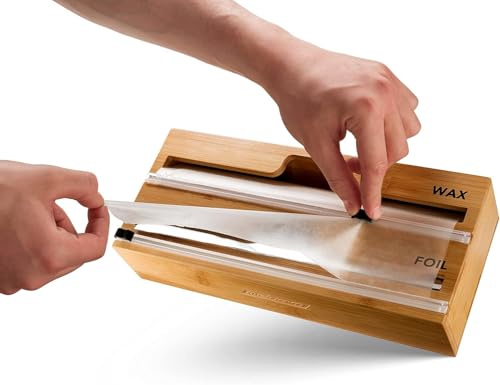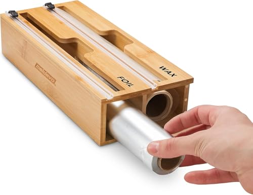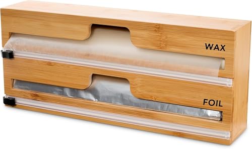 Generic - منظم تغليف 2 في 1 مع قطاعة وملصقات غلاف بلاستيكي رقائق الالومنيوم وورق الشمع لدرج المطبخ حامل بكرات الخيزران متوافق لفة 12 انش