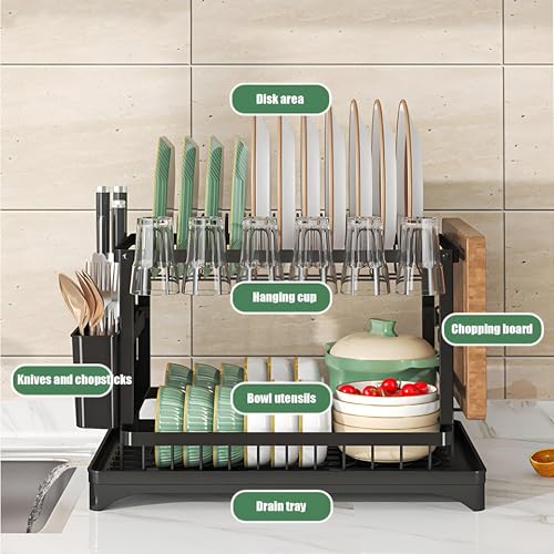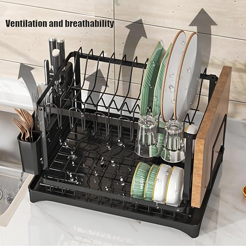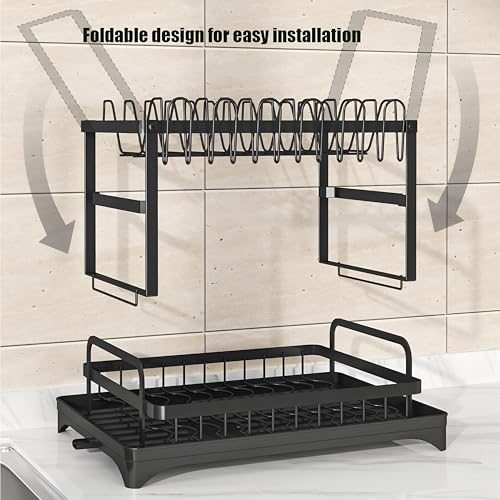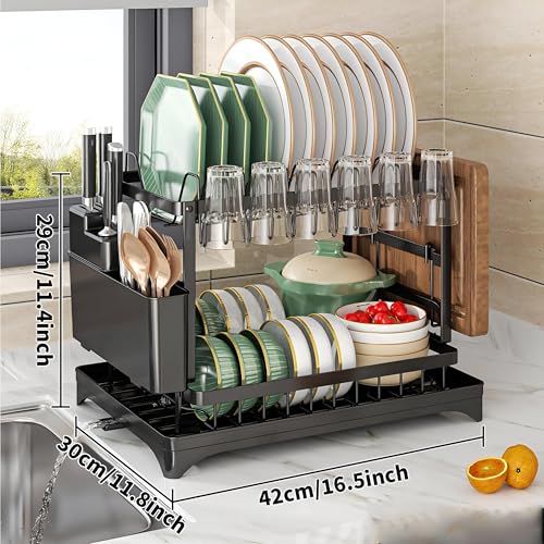 - يوفر رف تجفيف الأطباق القابل للطي المكون من طبقتين سعة استثنائية بأبعاد 42 × 30 × 29 سم، يستوعب ما يصل إلى 9 أطباق و6 أكواب وأوعية وأواني يخنة وصناديق الغداء وحتى أغطية الأواني، بينما يخزن حامل الأدوات القابل للإزالة السكاكين والشوك والملاعق والمقصات ومضارب البيض بأمان - مثالي لتنظيم أدوات المطبخ المتنوعة في مساحة صغيرة.
