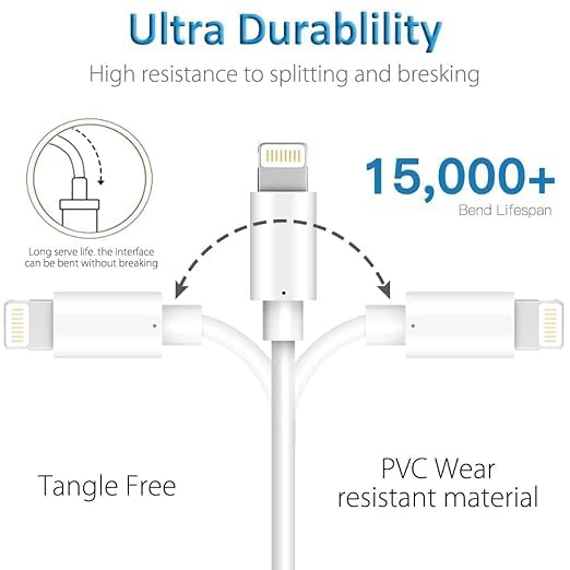 - [متانة معززة] - تضمن المواد الصلبة والموصل المقوى متانة لا تصدق، بالإضافة إلى عمر خدمة أطول. يمكن لكابل شاحن ايفون هذا أن يدعم أكثر من 20000 مرة من الانحناءات بزاوية 90 درجة، كما أنه مرن أيضًا.
